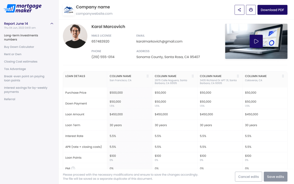 With lightning-fast report generation, interactive insights, and transparent pricing (no hidden fees!), Mortgage Maker empowers loan officers with the tools they need to win more business and provide a superior client experience.
