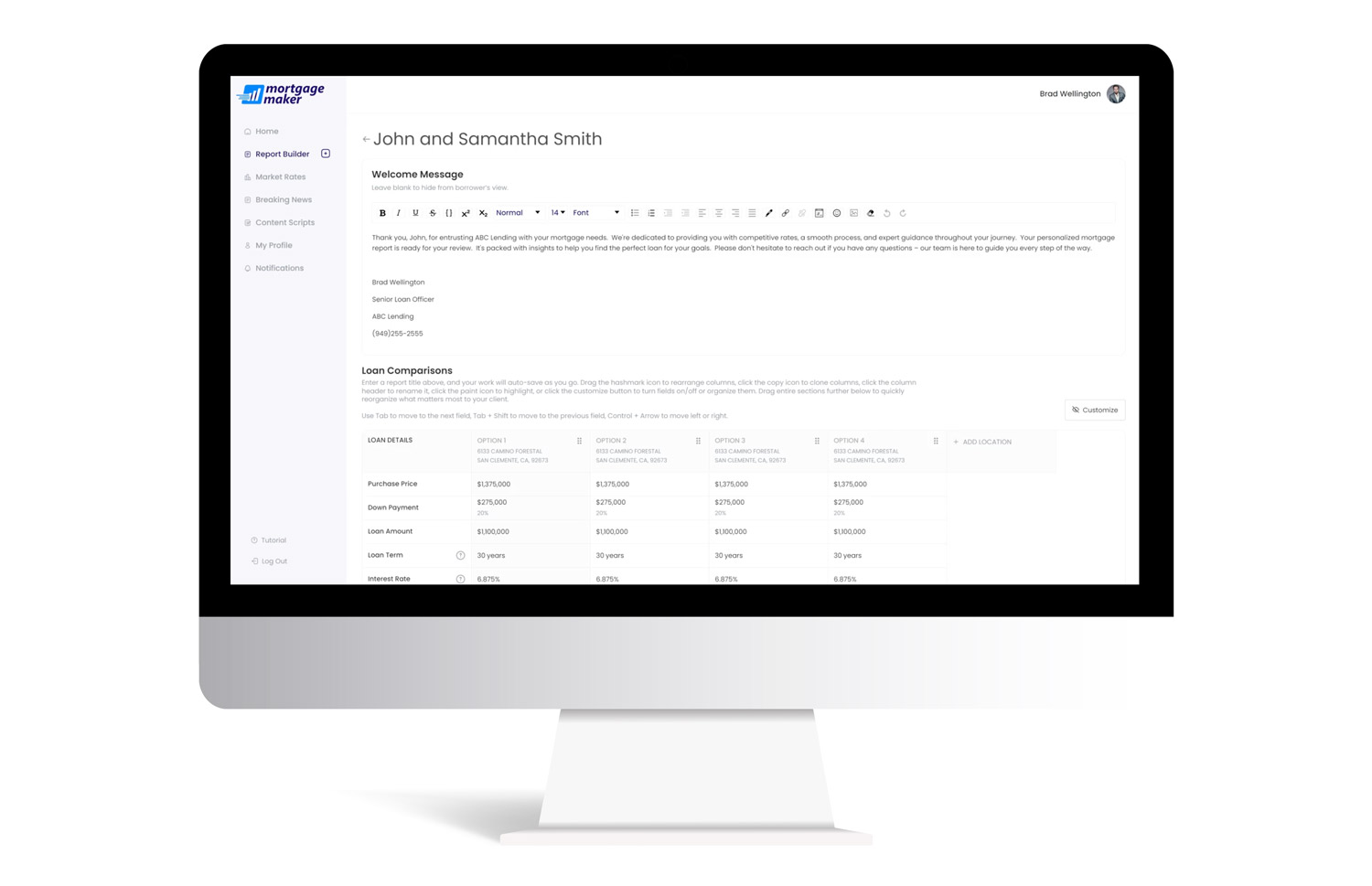 - Create detailed, visually appealing loan comparisons tailored to the client’s financial situation.