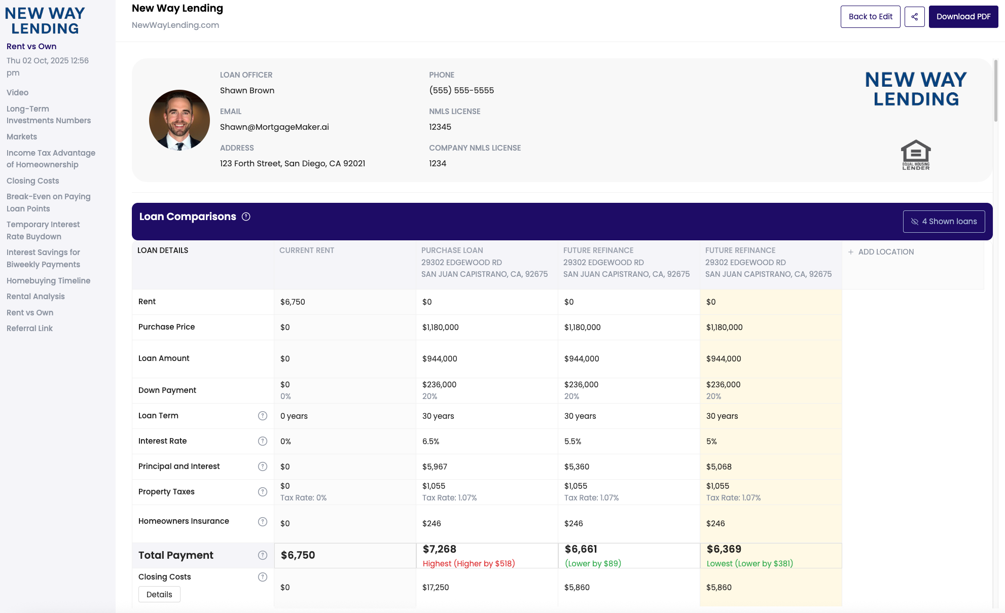 Unlike other mortgage presentation platforms, Mortgage Maker focuses on automation, personalization, and speed, eliminating tedious manual processes so you can spend more time closing loans and building relationships. Our software, built by a team of engineers, mortgage loan officers, and real estate professionals, adapts to each borrower’s needs, making complex loan scenarios easy to present and understand. With lightning-quick report generation, interactive insights, and transparent pricing (no hidden fees!), Mortgage Maker empowers loan officers with the tools they need to win more business and provide a positive client experience.